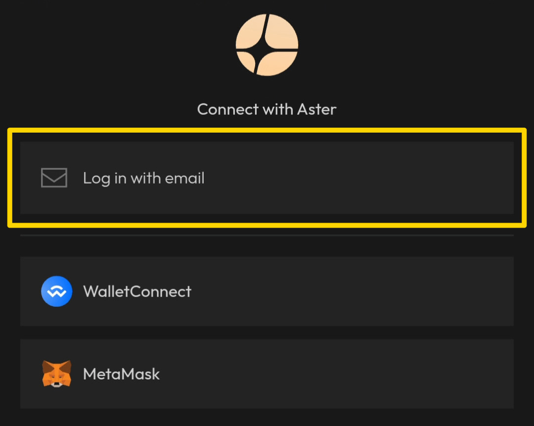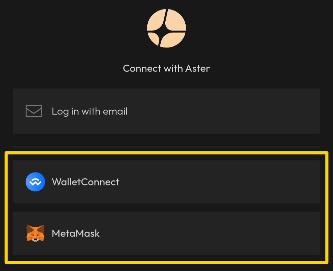 Aster offers two sign-up methods, connect with your wallet or register with your email. We’ll cover both, starting with wallet login.