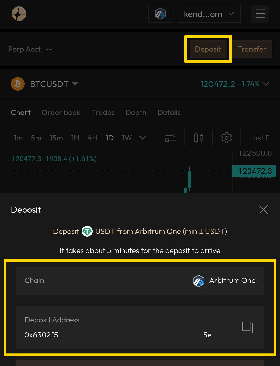 Step 5: Fund Your WalletClick deposit at the top right to display your wallet address. Transfer funds to your new address from your wallet or a CEX. The only blockchain currently available via email is Arbitrum One (USDT). Once USDT arrives in your new wallet, you can begin trading. ⚠️ Important: Only send USDT on Arbitrum One. Depositing other tokens or using the wrong chain may result in permanent loss of funds. *Rabby & Brave wallet also work. |